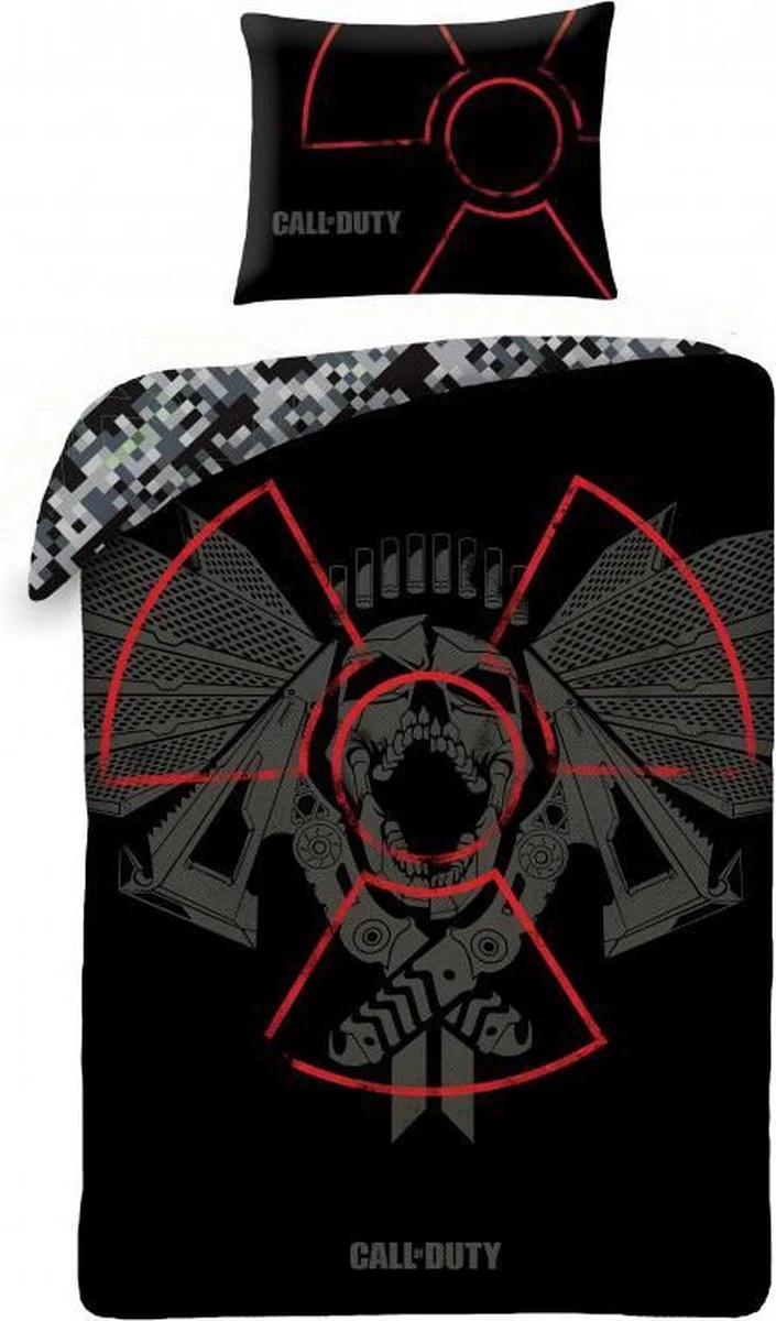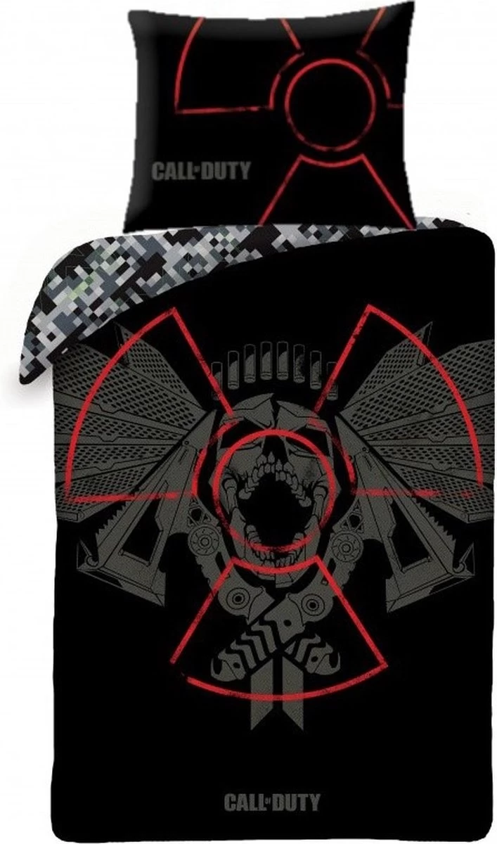 Call of Duty Dekbedovertrek Nuclear. Game liefhebbers opgelet; dit dekbed is een echte must-have! Dit dekbedovertrek heeft een coole Call of Duty afbeelding: de befaamde Nuclear streak! Als je genoeg aantal punten haalt, is de game direct over. Heb jij er al eens eentje gehaald? Het contrasterende dessin op de achterkant geeft het geheel een gaaf effect en is daardoor eventueel dubbelzijdig te gebruiken. Het overtrek is gemaakt van 100% katoen met een extra groot kussensloop. Een fantastisch cadeau voor elke fan van Call of Duty!