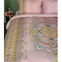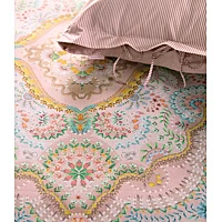 bloemen, die in Paisley-achtige vormen zichtbaar zijn. De banen aan de zijkant van het overtrek zijn voorzien van grotere bloemen en onder de gehele print zit een subtiele geprinte linnen textuur. Het heerlijk zacht aanvoelende overtrek heeft daarnaast een dubbele instopstrook over de gehele breedte, is wasbaar to 60 graden en kan in de droger.
