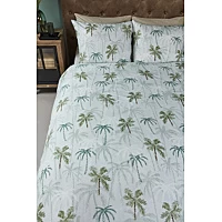 Dekbedovertrek – GroenWaan je op een tropisch eiland, met het dekbedovertrek Palm Parade van Rivièra Maison. Over het gehele overtrek, zowel aan de voor- als achterzijde, staan allemaal verschillende palmbomen afgebeeld tegen een ondergrond van een mooie geprinte structuur. De palmbomen op de voorgrond zijn vol van kleur en de naar achterliggende palmen verdwijnen meer in de structuur, wat zorgt voor diepte. De kussenslopen zijn rondom afgewerkt met een prachtige piping. Style het overtrek af met een van de bijpassende
