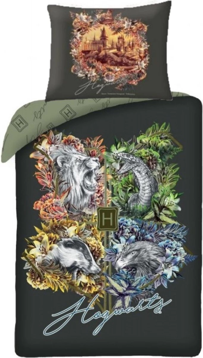 Harry Potter Dekbedovertrek, Zweinstein Logo. Een gaaf katoenen dekbedovertrek van Zweinstein, de Hogeschool voor Hekserij en Hocus-Pocus. Dit dekbedovertrek is voorzien van een grafisch logo van Zweinstein. Op het extra grote kussen is een afbeelding van de school zelf te zien. De overtrek heeft aan de achterkant een ander dessin, wat een leuk effect geeft bij het openslaan van het bed. Ook leuk om deze omgeslagen te laten bij het opmaken van het bed. Als fan van de Harry Potter films, mag deze set absoluut niet ontbreken in je collectie. Een echte aanwinst voor elke slaapkamer en een leuk cadeau idee voor een verjaardag of de feestdagen.