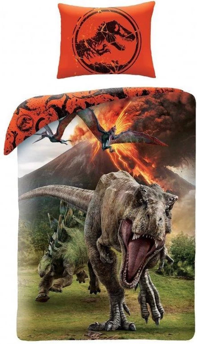 Het dekbedovertrek heeft een stoere opdruk met een T-rex , en nog andere dino”s , die op de vlucht zijn voor de uitbarstende vulkaan ! Een mooie print vol met spanning …