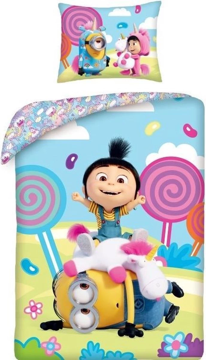 Minions Dekbedovertrek Lolly. Agnes is dol op haar pluizige eenhoorn knuffel, en Gru’s Minions ook. In een paradijs van donuts en lolly’s kunnen zij in hun onesies naar hartenlust met de eenhoorn spelen. Ga mee naar dit dromenland onder dit superleuke dekbedovertrek van Despicable Me. Het dekbedovertrek is van 100% katoen gemaakt en dus prettig om onder te slapen.