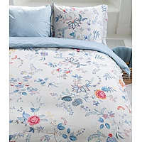 Pip Studio Flower Festival Wit Percal-260 x 200 / 220 cm | Extra Breed. Dit dekbedovertrek met Flower Festival dessin is van het merk Pip Studio. Het is gemaakt van 100% BCI Percal Katoen en heeft de kwaliteit 200 TC. U kunt dit overtrek herkennen aan het stijlvolle design met onder andere fantasierijke chintzbloemen en bladeren. De achterkant is voorzien van een gestileerde geometrische print en de zijkanten hebben een