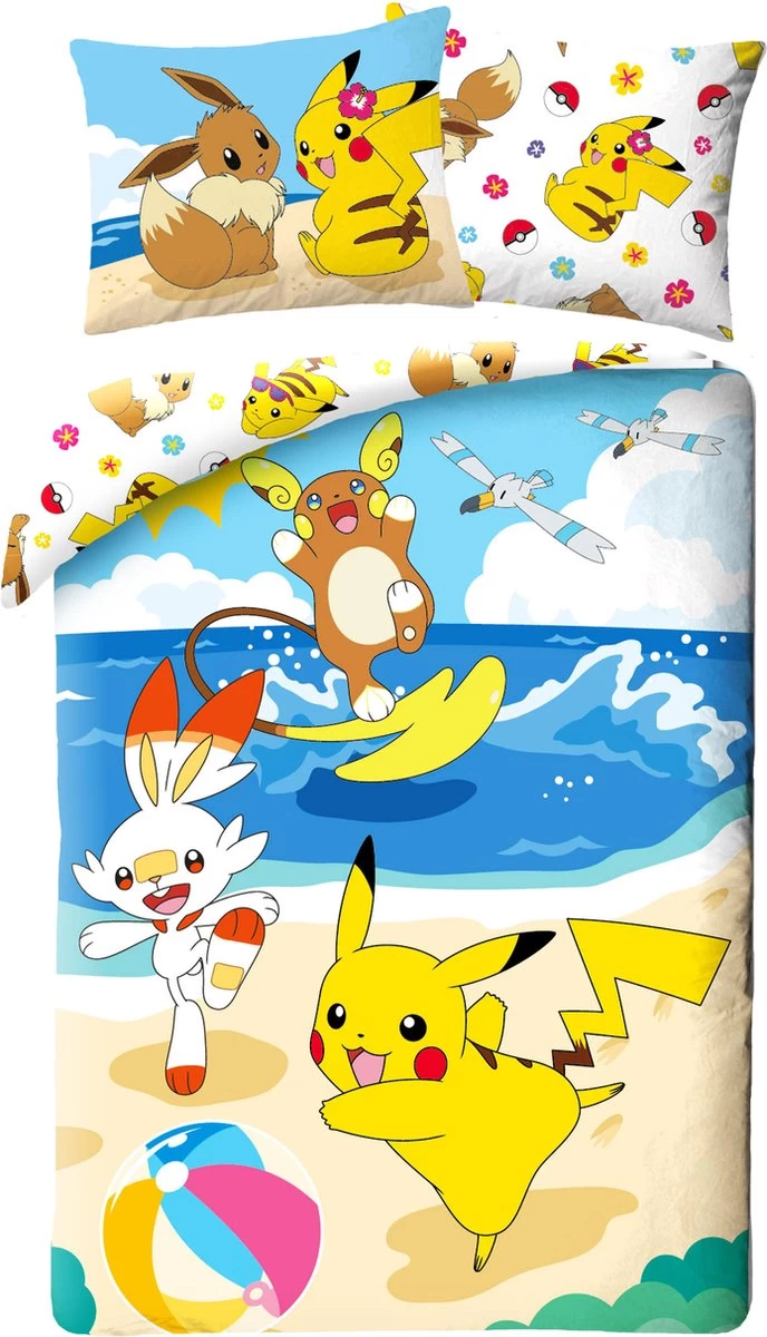 Pokémon Dekbedovertrek, Beach. Pikachu , Raichu, Wingull, Eevee en meer. Zij hebben wel een dagje rust verdiend! Dit gave katoenen dekbedovertrek van een paar van de bekendste Pokémon karakters erop, is een echte musthave voor de die-hard Pokémon fan. Hiermee haal je een echte blikvanger in huis. Mede door het extra grote kussensloop en de tweezijdige bedrukking van het overtrek. Leuk om eens af te wisselen met het opmaken van het bed. Kortom; een leuk item om cadeau te doen óf te krijgen!