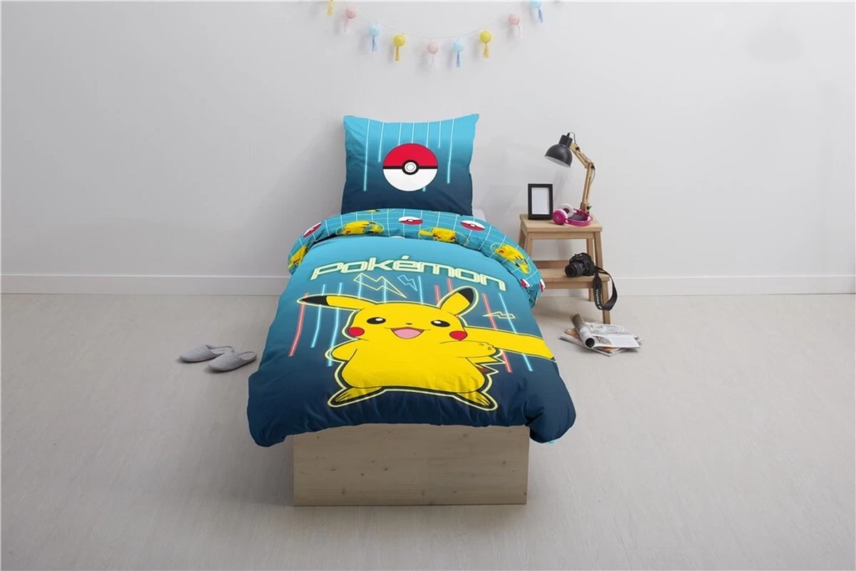 Dan is dit het perfecte dekbedovertrek voor in jouw slaapkamer! Op de kussensloop staat aan beide kanten één grote pokeball.Op de ene kant van het overtrek is Pikachu in het groot te zien en op de andere kant staan heel veel kleine Pikachu’s met pokeballs. Welke kant leg jij bovenop? Het is helemaal aan jou. Het overtrek is gemaakt van 100% katoen en heeft een formaat van 140 x 200 cm.