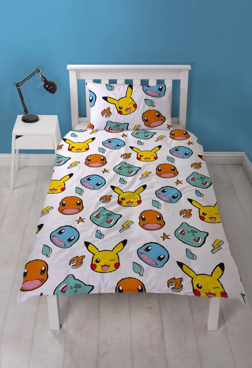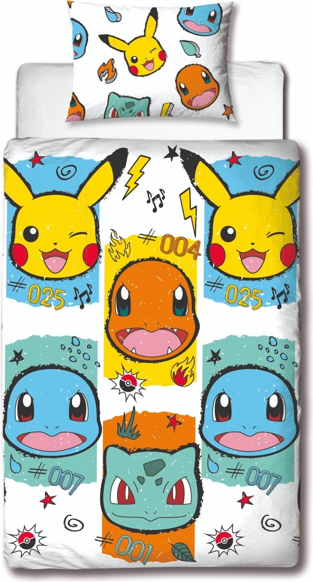 Pokémon Dekbedovertrek, Starters. Wat een gaaf dekbedovertrek, geschikt voor jong en oud. Pokémon is wereldberoemd, maar de allerbekendste Pokémon blijft natuurlijk Pikachu, bekend als de eerste Pokémon van Ash Ketchum. Op dit dekbedovertrek wordt Pikachu vergezeld door Bulbasaur, Squirtle en Charmander: de eerste starter-Pokémon binnen de games! In de animatieserie komen ze ook vaak voor. Dit leuke dekbedovertrek is een fantastisch cadeau voor iedereen die van Pokémon houdt.