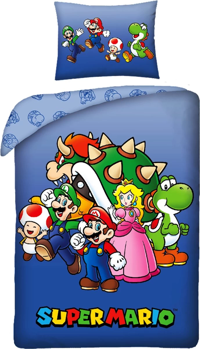 Super Mario Dekbedovertrek, Team. Als jij fan bent van de Super Mario Games, dan mag dit katoenen dekbedovertrek absoluut niet ontbreken in je collectie. Deze stoere overtrek heeft een afbeelding van alle bekende figuren uit deze spelletjes. Zo zien we o.a. Luigi, Yoshi, Princess Peach, Toad en zelfs de grote schurk Bowser. Welke is jouw favoriet? Het dekbedovertrek en extra groot kussensloop zijn dubbelzijdig bedrukt, wat een leuk effect geeft bij het opmaken. Kortom; een echte blikvanger en een must-have voor de liefhebber van Super Mario!